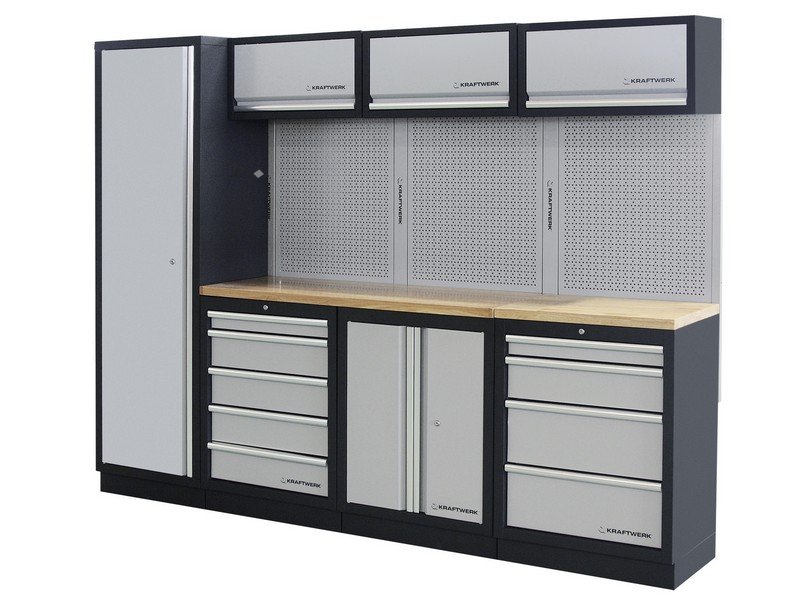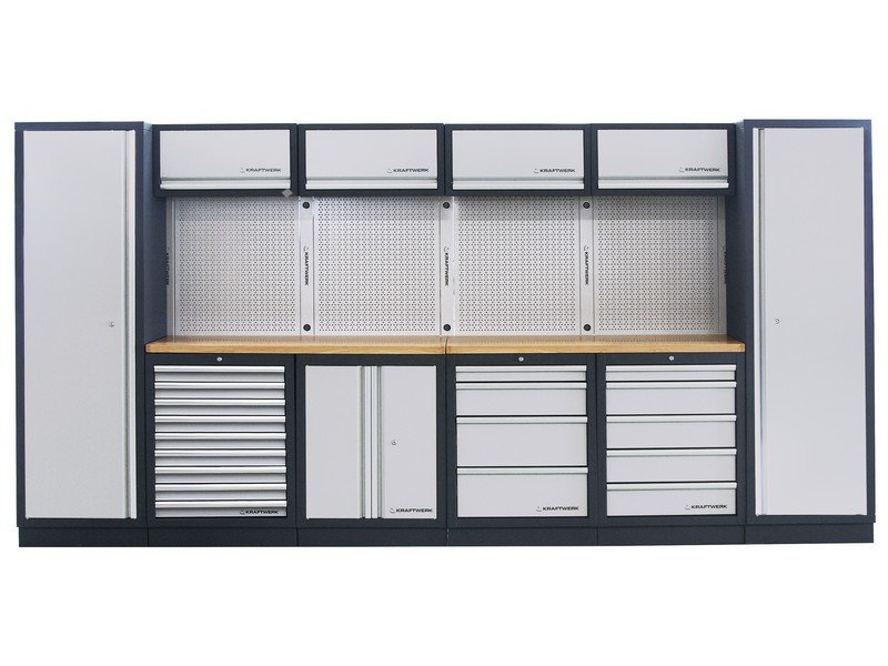 - modulární nástěnný systém skříněk MOBILIO - volně stojící konstrukce pro velmi flexibilní instalaci - zásuvky různých výšek, uloženy na kuličkových ložiscích - s centrálním zamykáním, včetně pojistek u jednotlivých zásuvek - pro výbavu KRAFTWERK COMPLETO / EVA / EVA3 - stěnové panely s EURO perforací - multiplex pracovní deska tl. 35 mm z bukového dřeva, s ochranným lakem z lněného oleje