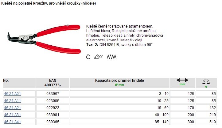 KN-4621A01 Kleště segerové A01 vnější vyhnuté 90° 3-10/125mm 6