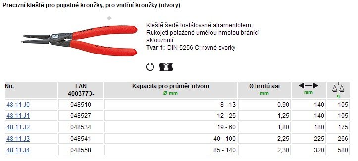 KN-4811J1 Kleště segerové precizní J1 vnitřní rovné 12-25/140mm 6