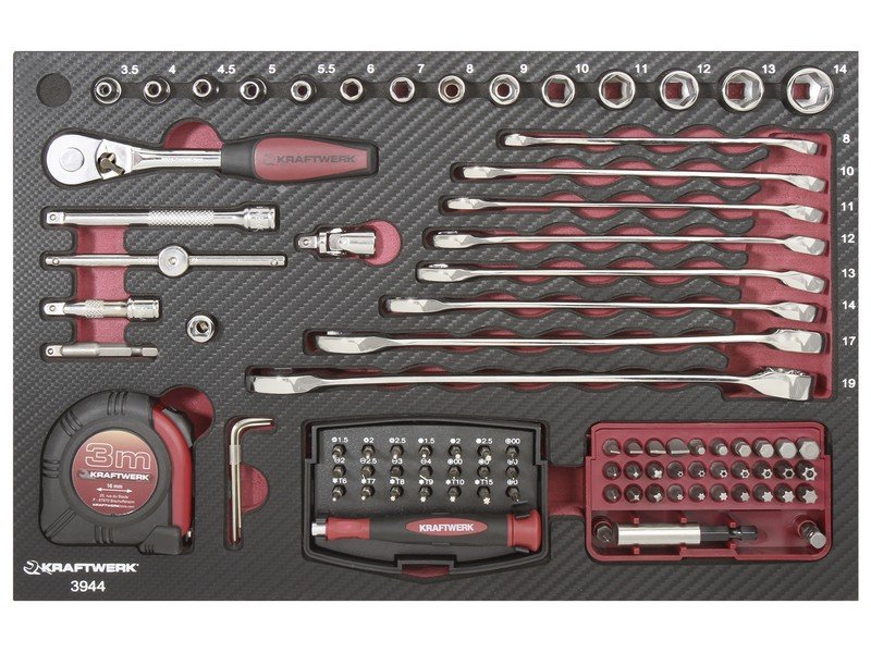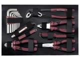 • nářadí je uloženo ve speciálním pěnovém prolisu EVA a v gumách na jednotlivých vložkách nebo ve víku kufru