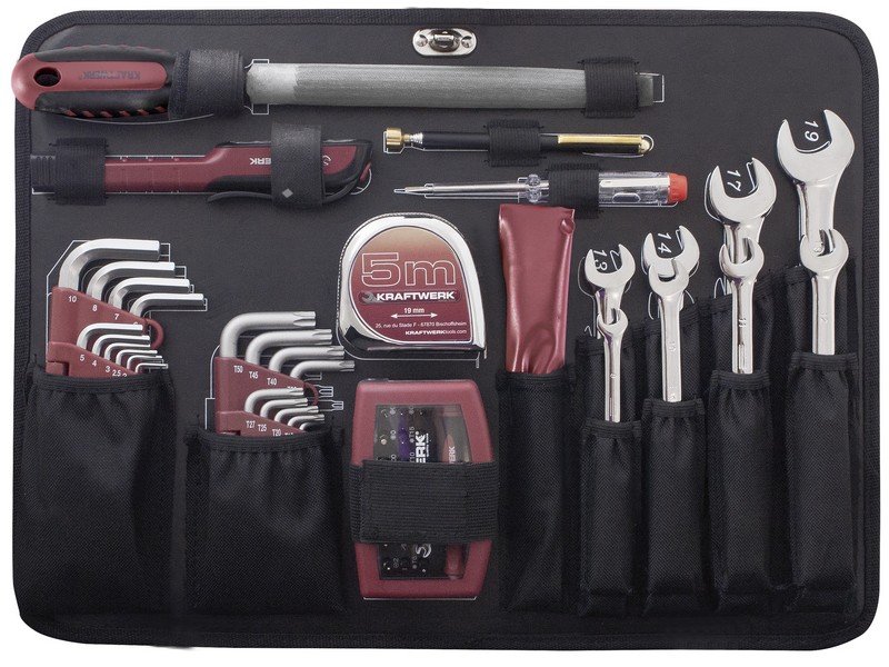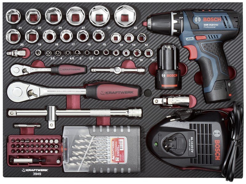 - nářadí je uloženo ve speciálním pěnovém prolisu EVA a v gumách na jednotlivých vložkách nebo ve víku kufru