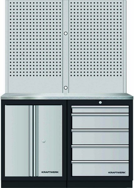 AKCE KW Dílenský stůl 1360x488x2000mm, 2 dveře + 5 zásuvek + záda, deska NEREZ MOBILIO GREY dílenský nábytek
