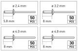 • součastí sady jsou hliníkové nýty 2,4 - 3,2 a 4,0mm á 50ks, průměr 4,8mm 30ks