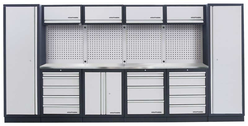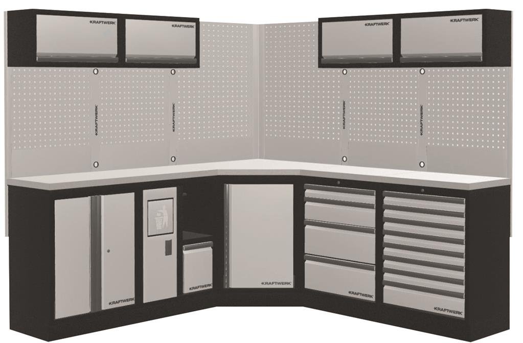 - modulární nástěnný systém skříněk MOBILIO - volně stojící konstrukce pro velmi flexibilní instalaci - zásuvky různých výšek, uloženy na kuličkových ložiscích - s centrálním zamykáním, včetně pojistek u jednotlivých zásuvek - pro výbavu KRAFTWERK COMPLETO / EVA / EVA3 - stěnové panely s EURO perforací - pracovní deska INOX tl. 38 mm obsahuje: - 4x skříňka horní - 1x skříňka spodní 2 dveře - 1x skříňka spodní 4 zásuvky - 4x výztuha zadní 1420x65x30mm bez otvorů - 2x deska INOX 1361x463x38mm - 4x výztuha zadní 30x32,5x1420mm bez otvorů - 1x skříňka spodní s odpadkovým košem - 1x skříňka spodní 8 zásuvek - 1x skříňka spodní rohová, 1 dvířka, zamykatelná, - 4x panel zadní děrovaný 615x24x1052mm s čtvercovými otvory - 2x panel zadní děrovaný s čtvercovými otvory pro rohovou skříňku KR-39 - 1x deska INOX pro rohovou skříňku 3964-16