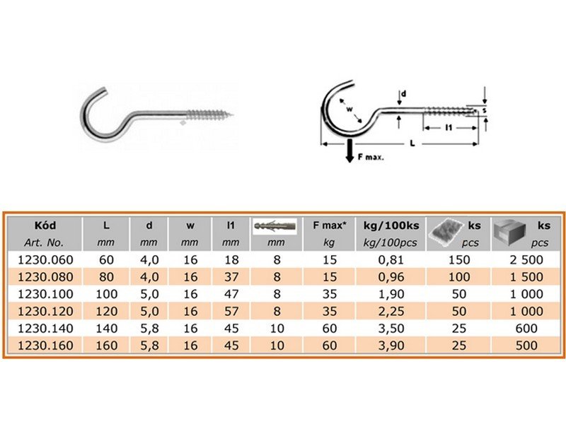 LR-1230.060 Hák stropní s vrutem 60mm Zn 10