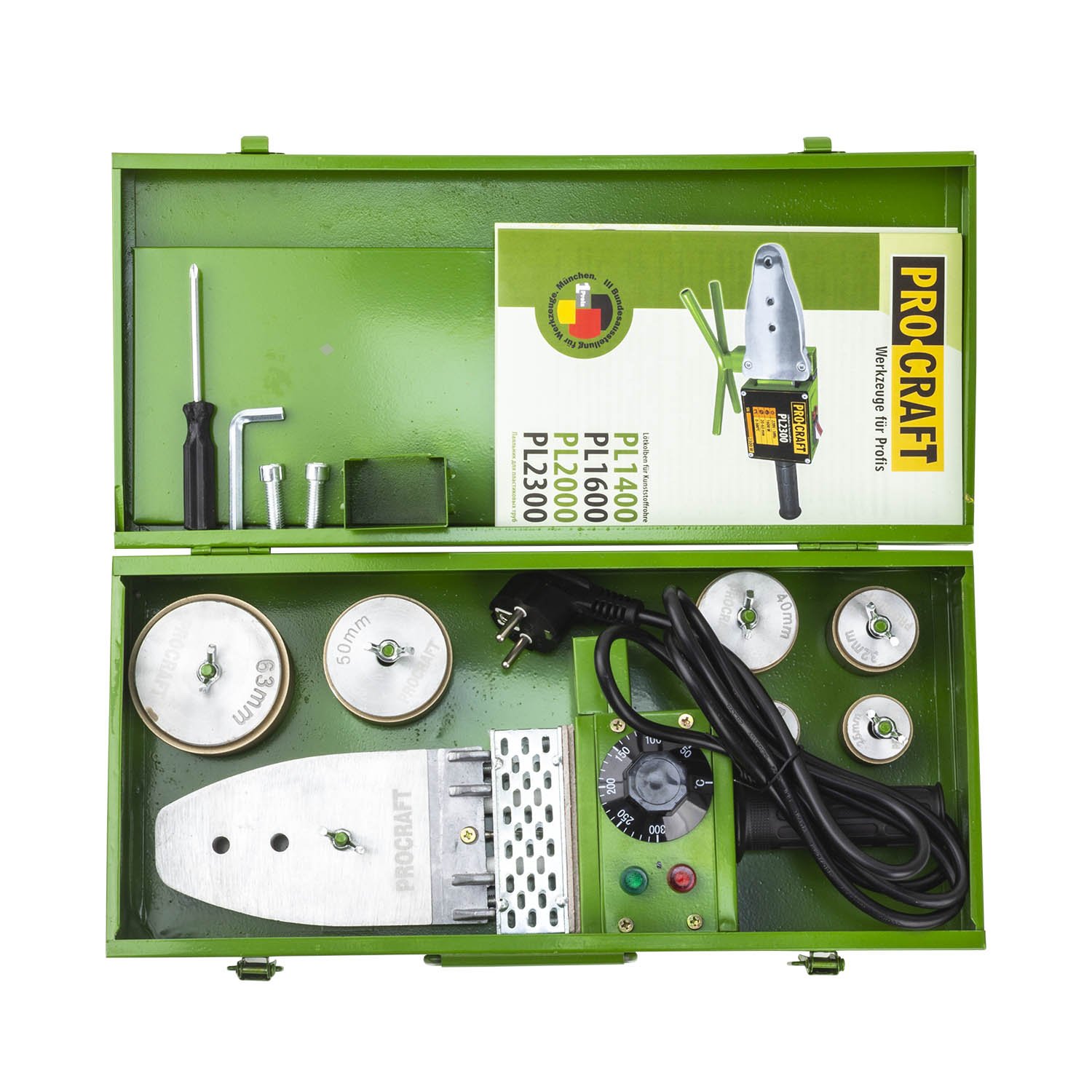 • součástí dodávky jsou nástavce s teflonovým povrchem D20/25/32/40/50/63mm, kovový kufřík, šroubovák, imbusový klíč