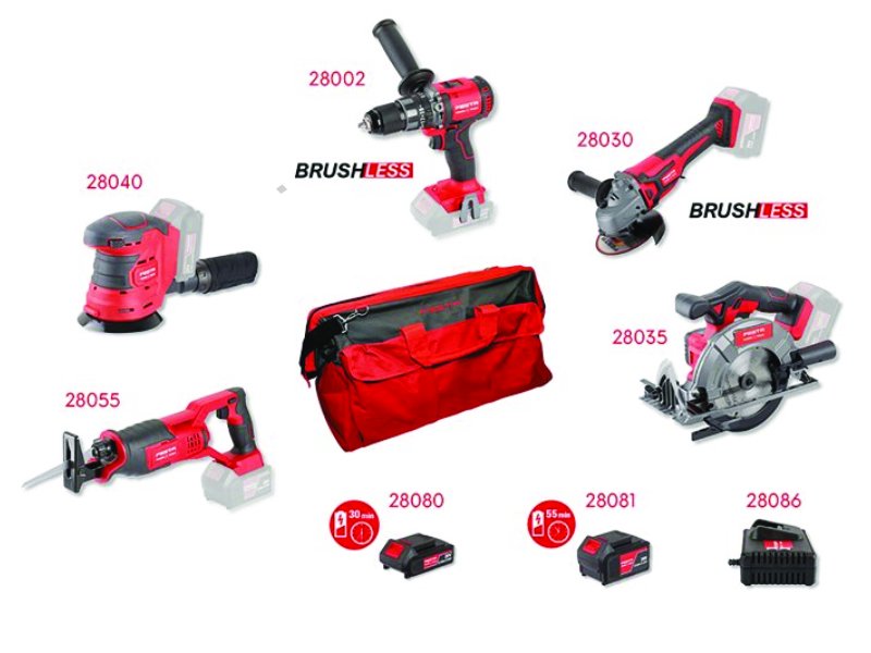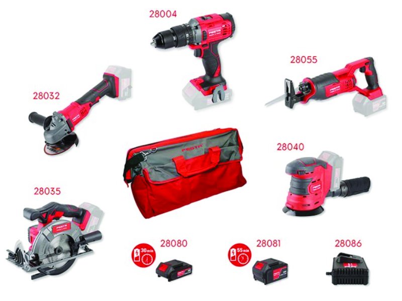 - výhodná sestava AKU nářadí FESTA Power tools s praktickou taškou zdarma - sestava nejběžněji používaných AKU strojů pro různé druhy prací, stroje jsou součástí systému FESTA SHARE20V s možností využívat Li-ion batarie 2.0 Ah a 4.0 Ah vevšech strojích - součástí sady je i rychlonabíječka a baterie 4.0 a 2.4 Ah - pro běžnou práci je baterie s kapacitou 2.0 Ah (28080) dostačující - nabíjecí čas 40 min., pro práci s předpokladem větší zátěže, doporučujeme použít baterii s kapacitou 4.0 Ah (28081) - nabíjecí čas 90 min - Li-ion technologie použitá v bateriích FESTA Power x tools nabízí možnost dobíjet baterie kdykoliv - bez snižování jejich kapacity, u Li-ion baterií také dochází k jen velmi pomalému samovybíjení - stroje v sadě 28004, 28032, 28035, 28040, 28055