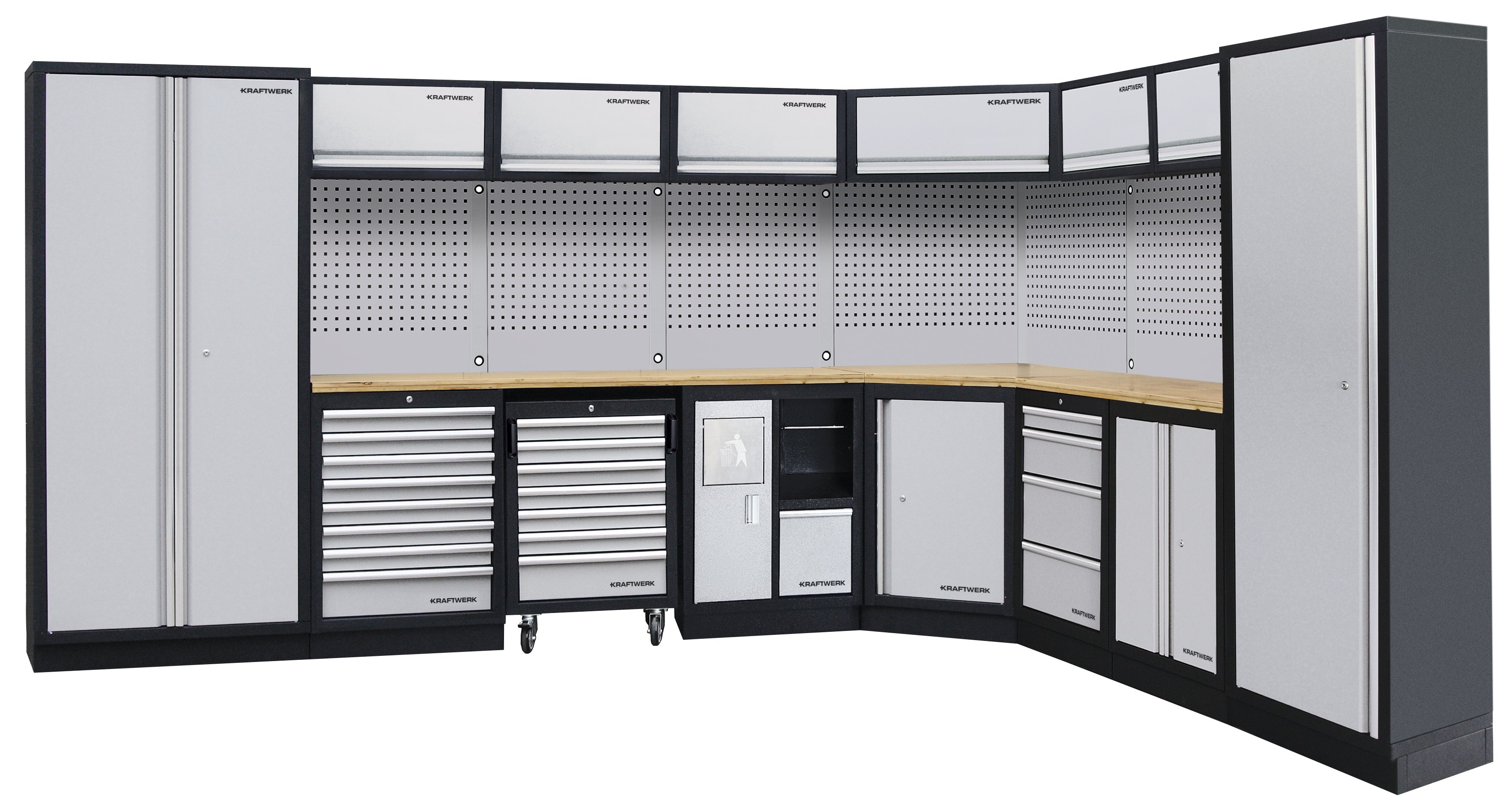 - modulární nástěnný systém skříněk MOBILIO - volně stojící konstrukce pro velmi flexibilní instalaci - zásuvky různých výšek, uloženy na kuličkových ložiscích - s centrálním zamykáním, včetně pojistek u jednotlivých zásuvek - pro výbavu KRAFTWERK COMPLETO / EVA / EVA3 - stěnové panely s EURO perforací - multiplex pracovní deska tl. 35 mm z bukového dřeva, s ochranným lakem z lněného oleje obsahuje: - 4x výztuha zadní 30x32,5x1420mm bez otvorů - 1x skříňka spodní rohová, 1 dvířka, zamykatelná, 864x864x910mm - 1x deska Multiplex (bukové dřevo) pro rohovou skříňku 3964-16 - 1x skříňka horní rohová 865x865x350mm - 2x panel zadní děrovaný s čtvercovými otvory pro rohovou skříňku KR-3964-16