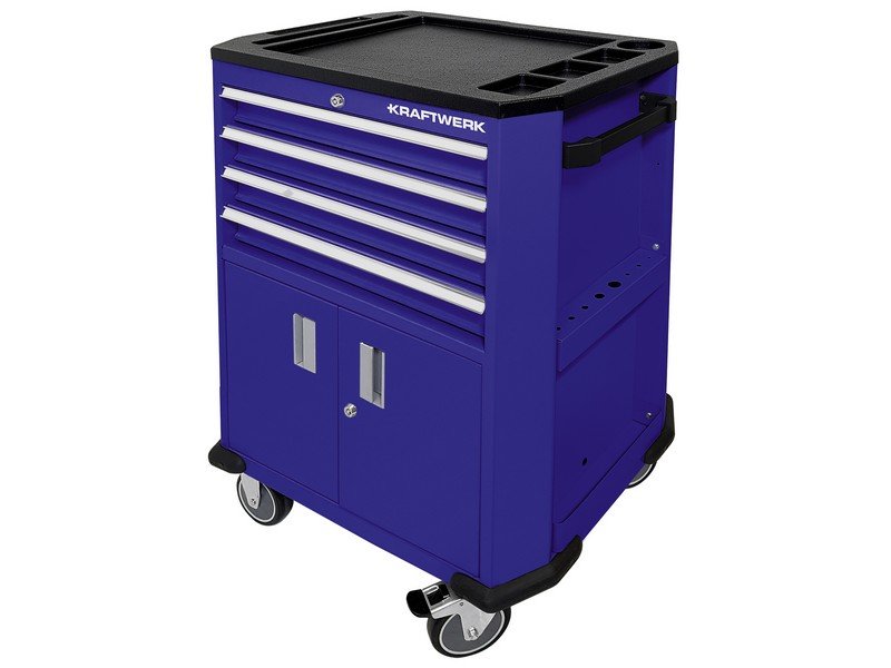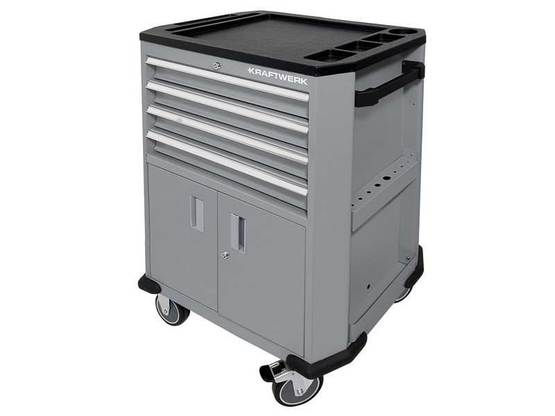 - dílenský vozík 4 zásuvky a dvířka - zásuvky na kuličkových ložiscích, lehce pohyblivé, vyjímatelné a ovladatelné - centrální zámek všech zásuvek s cylindrickým zámkem - pojistka pro otevření pouze 1 zásuvky zabraňuje současnému otevření několika zásuvek - další úložný prostor ve spodní části vozíku - s integrovaným držákem šroubováků - boční polička jako přídavná úložná plocha - vodící kola s brzdou - robustní plastová horní deska s prolisy - ochrana hran z tvrzeného plastu