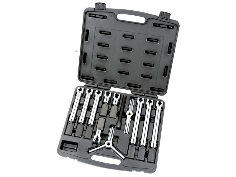 - sada nástrojů pro stlačení vinutých pružin se 3 páry bočních nástavců - průměr 90-160mm - výměnné upínací desky - čelisti s plastovou ochranou proti poškození antikorozního nátěru pružin - určeno pro vozy: - Audi, BMW, Ford, Honda, Mitsubishi, Nissan, Porsche, Saab, Subaru, Toyota, Volvo a VW