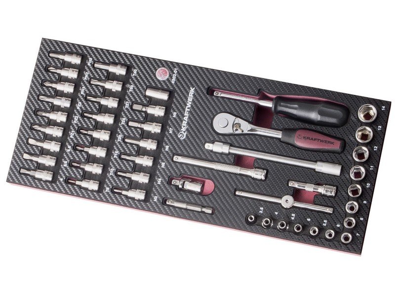 - 46-ti dílná gola sada 1/4" s příslušenstvím - nástavce vyrobeny z kvalitní chromvanadiové oceli - povrchová úprava: chrom - leštěný povrch - bity vyrobeny z S2 oceli (chrom/silicium/magnesium/molybden/vanadium) - uloženo ve speciální pěnové EVA3 vložce s vysokou hustotou pěny a lamino karbonovým povrchem s uhlíkovým vzhledem, pro snadné čištění - určeno pro vozíky B107, B117, P205, P207, P206, P407, P407L, P306, P308, EXTRA LARGO, P203