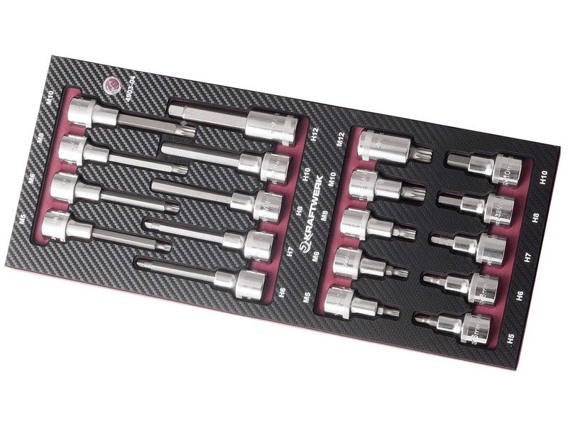 - 19-ti dílná souprava 1/2" nástavců - nástavce Inbus + XZN - délka 55 a 100mm - vyrobeny z kvalitní chromvanadiové oceli - povrchová úprava: chrom - leštěný povrch - uloženo ve speciální pěnové EVA3 vložce s vysokou hustotou pěnya lamino karbonovým povrchem s uhlíkovým vzhledem, pro snadné čištění - určeno pro vozíky B107, B117, P205, P207, P206, P407, P407L, P306, P308, EXTRA LARGO, P203