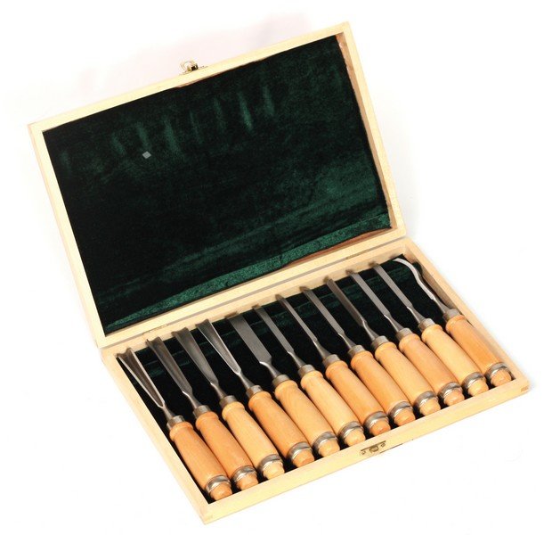 - 12-ti dílná souprava dlát - různé tvary ostří - ergonomická rukojeť z bukového dřeva - úderová plocha s kovovým kroužkem