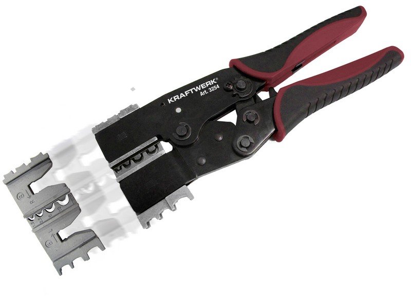 - ráčnové kleště na kabelové koncovky - s oboustrannými vyměnitelnými čelistmi - pro izolované i neizolované koncovky - včetně čelistí pro lisování izolovaných a uzavřených svorek