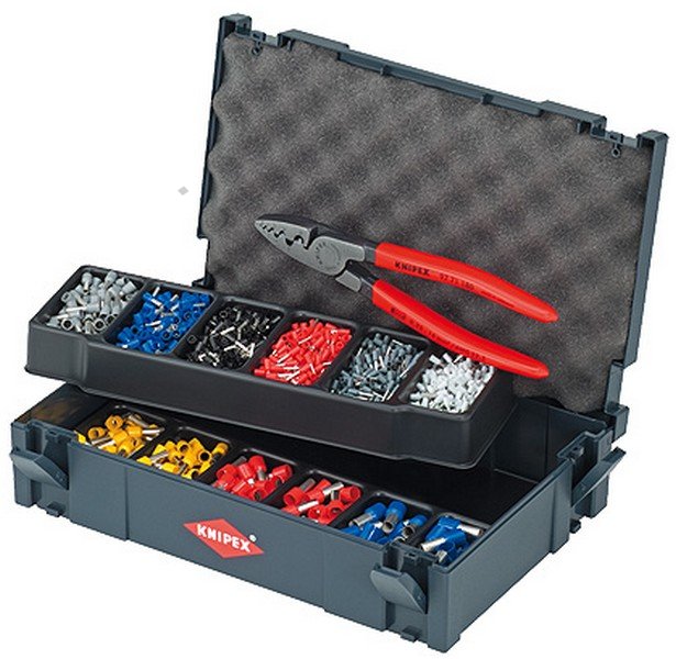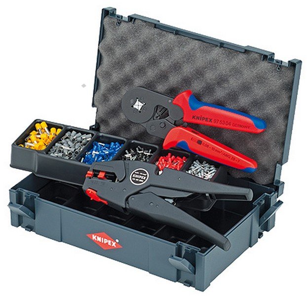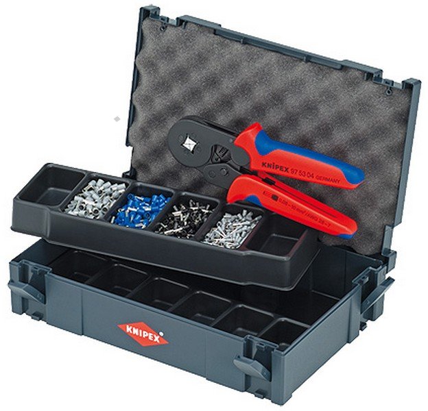 - TANOS MINI-systainerR (stabilní plastový box) - dvě stohovatelné plastové vložky každá se 6 výstupky pro spojky - lisovací kleště KNIPEX PreciForce® - sortiment běžných koncových dutinek s izolací