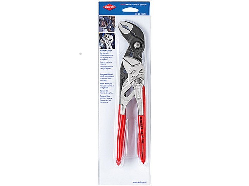 - 2-dílná souprava kleští Cobra - samosvorné na trubkách a maticích - plochy čelistí se speciálně kalenými zuby - tvrdost zubů 61 HRC - trvale spolehlivé uchopení - vysoká odolnost proti opotřebení - posuvný průchozí čep kloubu - vysoká stabilita díky dvojitémuvedení - spolehlivé zaskočení čepu kloubu - ochrana proti sevření zabraňují poraněním způsobeným uskřípnutím - dobrá přístupnost k obráběnému předmětu - chromvanadová elektroocel, kovaná, kalená v oleji - kleště šedě fosfátované atram entolem - leštěná hlava - rukojeti potažené umělou hmotou bránící sklouznutí