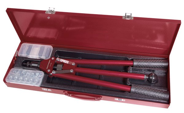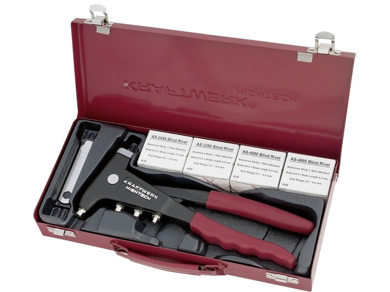 - kleště se 4-mi vyměnitelnými nástavci, které lze ukládat do rukojeti - průměr nástavců 2,4 / 3,2 / 4,0 a 4,8mm - pro nýty hliníkové, ocelové a nerezové - součastí sady jsou hliníkové nýty 2,4 - 3,2 a 4,0mm á 50ks, průměr 4,8mm 30ks -uloženo v kovové kazetě