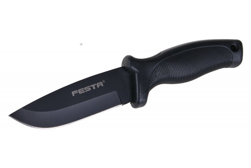 - nůž se zesílenou čepelí - plastová rukojeť - kožené pouzdro s klipem na opasek