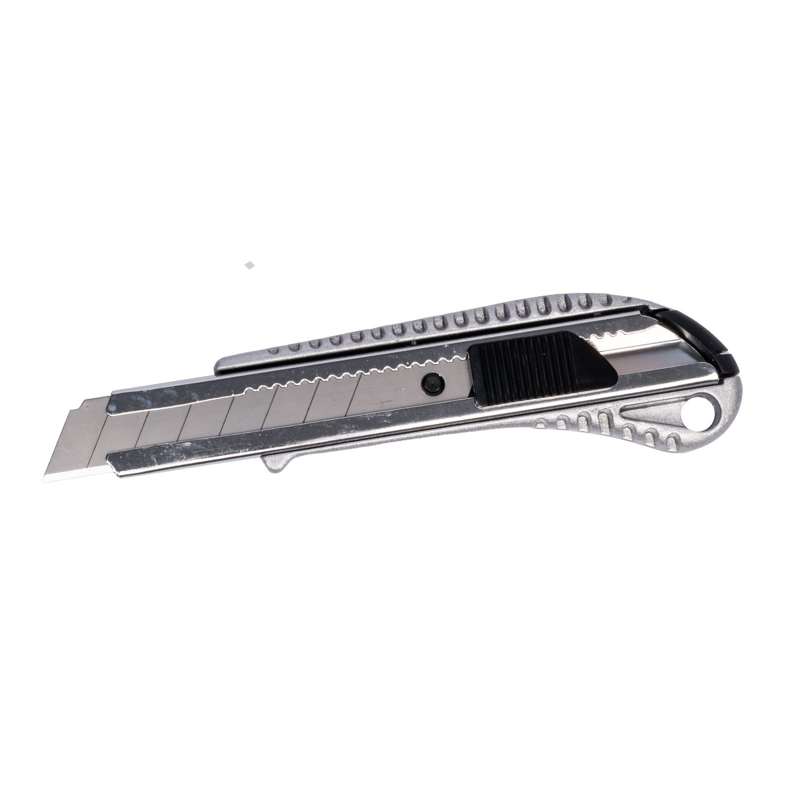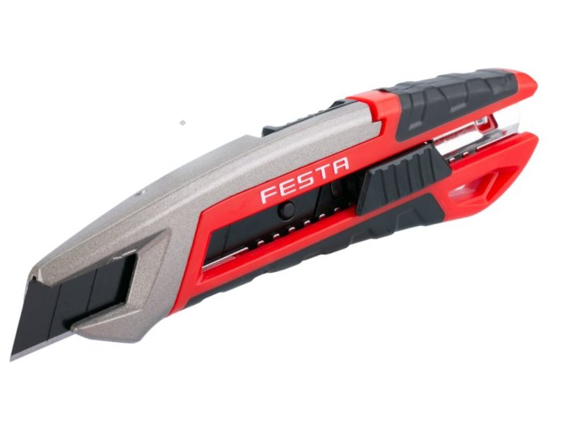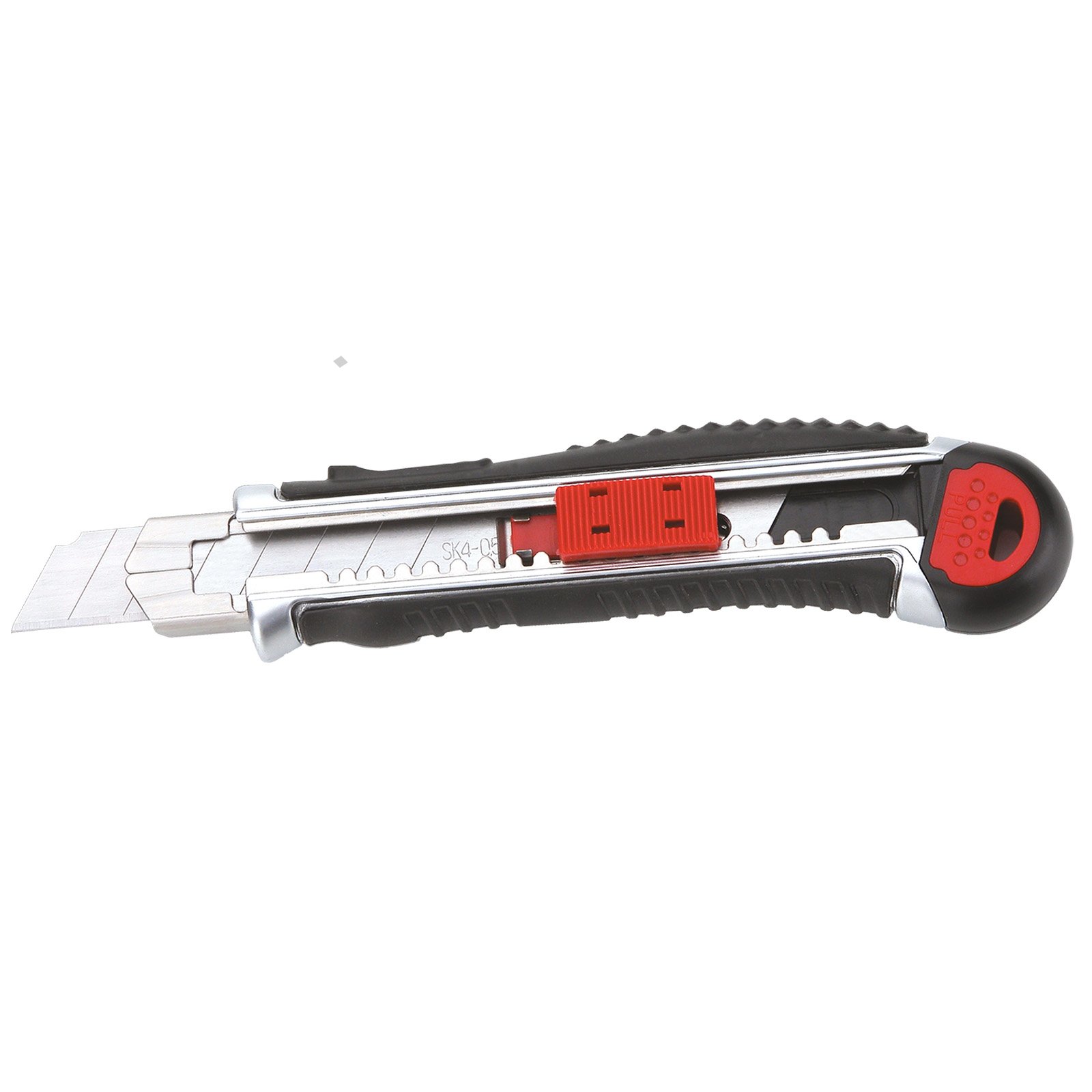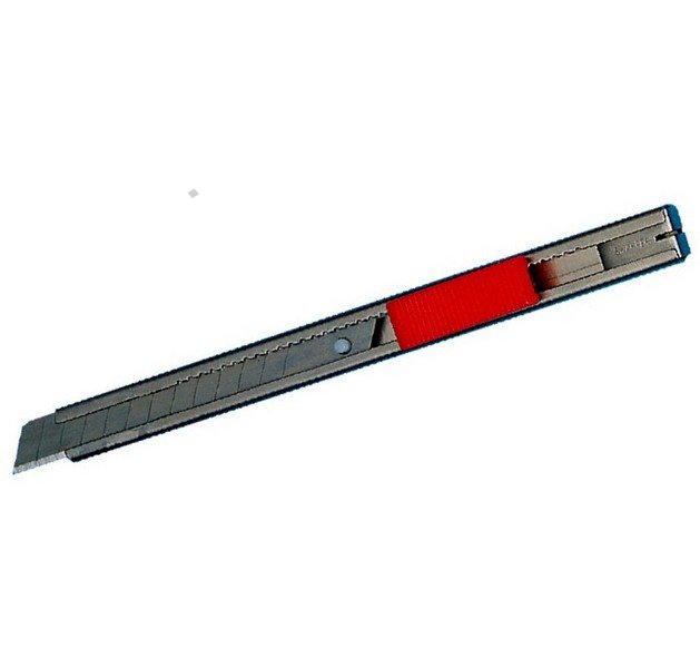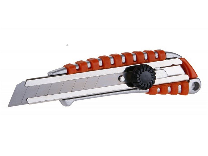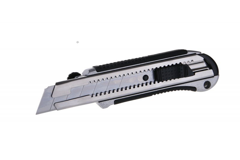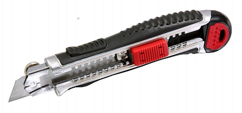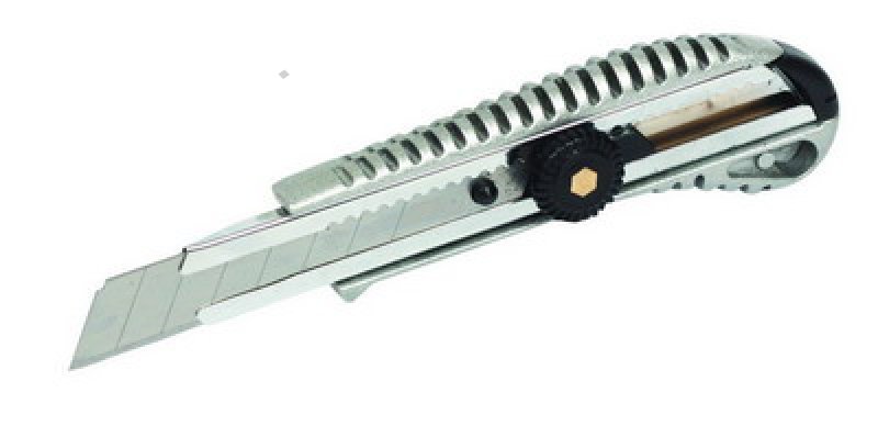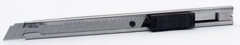 Celokovový ulamovací nůž s pogumovanou rukojetí a vodící lištou. Ocelové vodítko čepele se vždy automaticky uzamkne proti pohybu. Šroubová aretace na zadní straně. Nůž má mezinárodní patent na aretaci břitu pro větší bezpečnost. Černěný povrch odolný proti korozi.