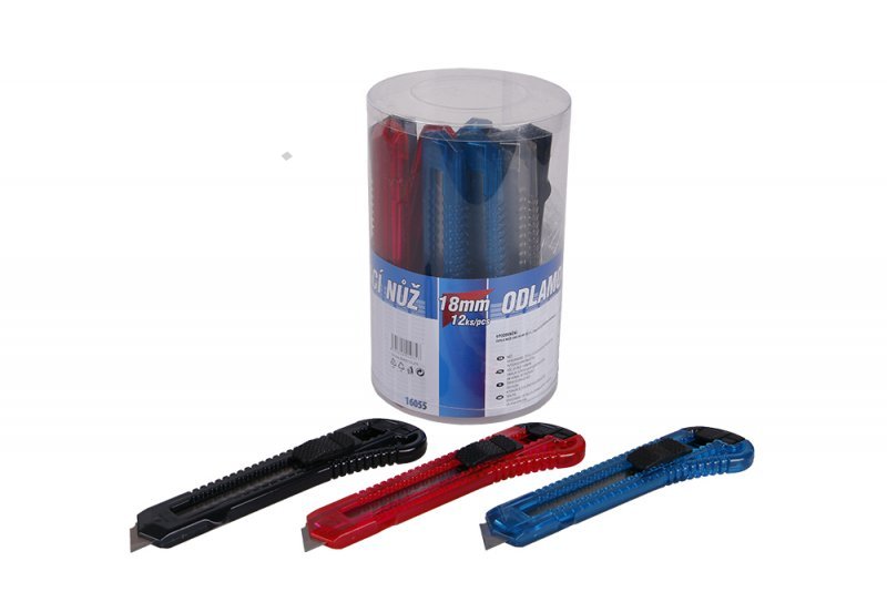 - odlamovací nůž 18 mm s pákovým odlamováním čepele - ergonomický tvar, kvalitní plast v kombinaci s gumou pro pevný a pohodlný úchop - speciální pákový mechanizmus ze slitiny hliníku pro bezpečné odlomení čepele s magnetem pro zachyceníodlomeného segmentu - posuvný jezdec s automatickou aretací - doporučené čepele 18 mm - 16062