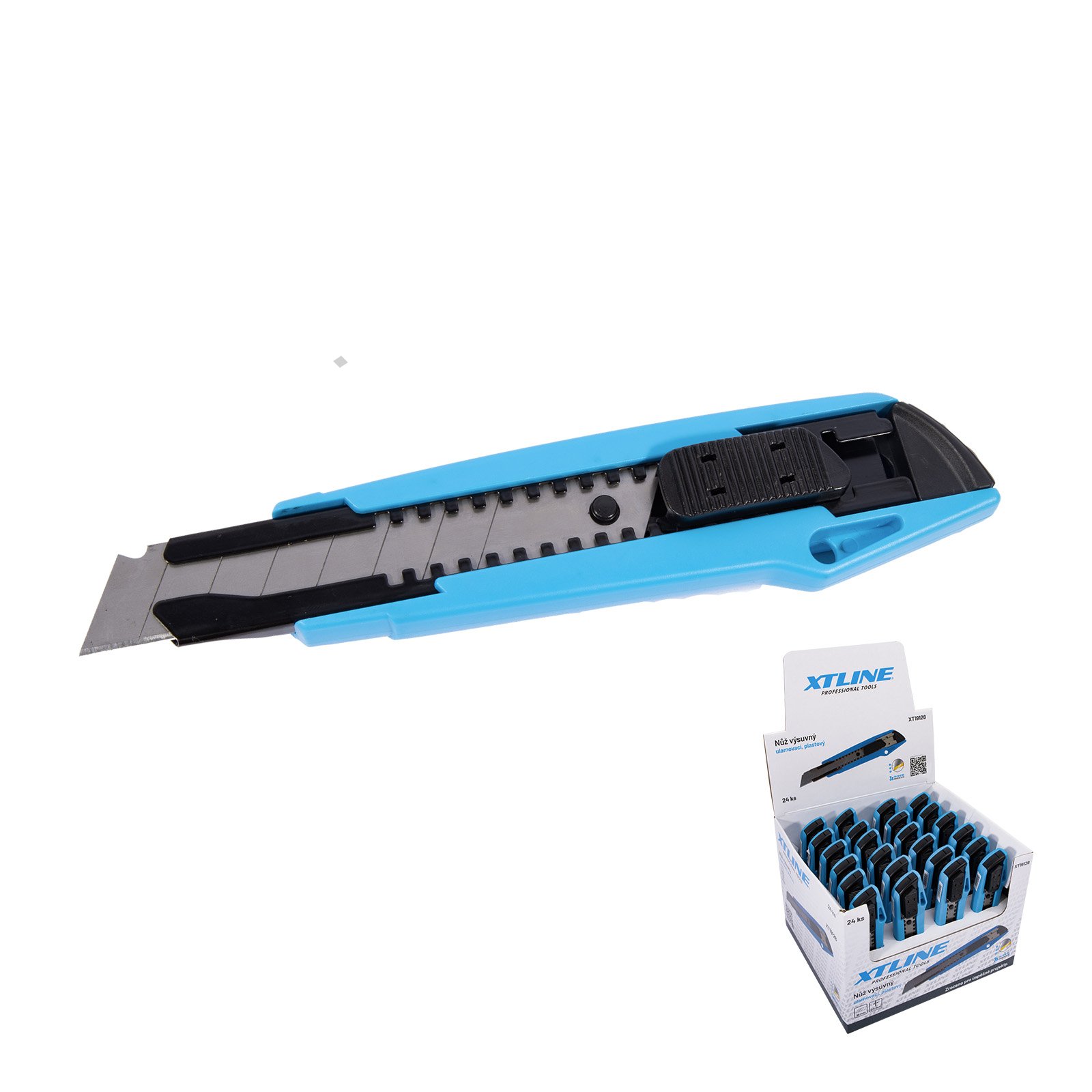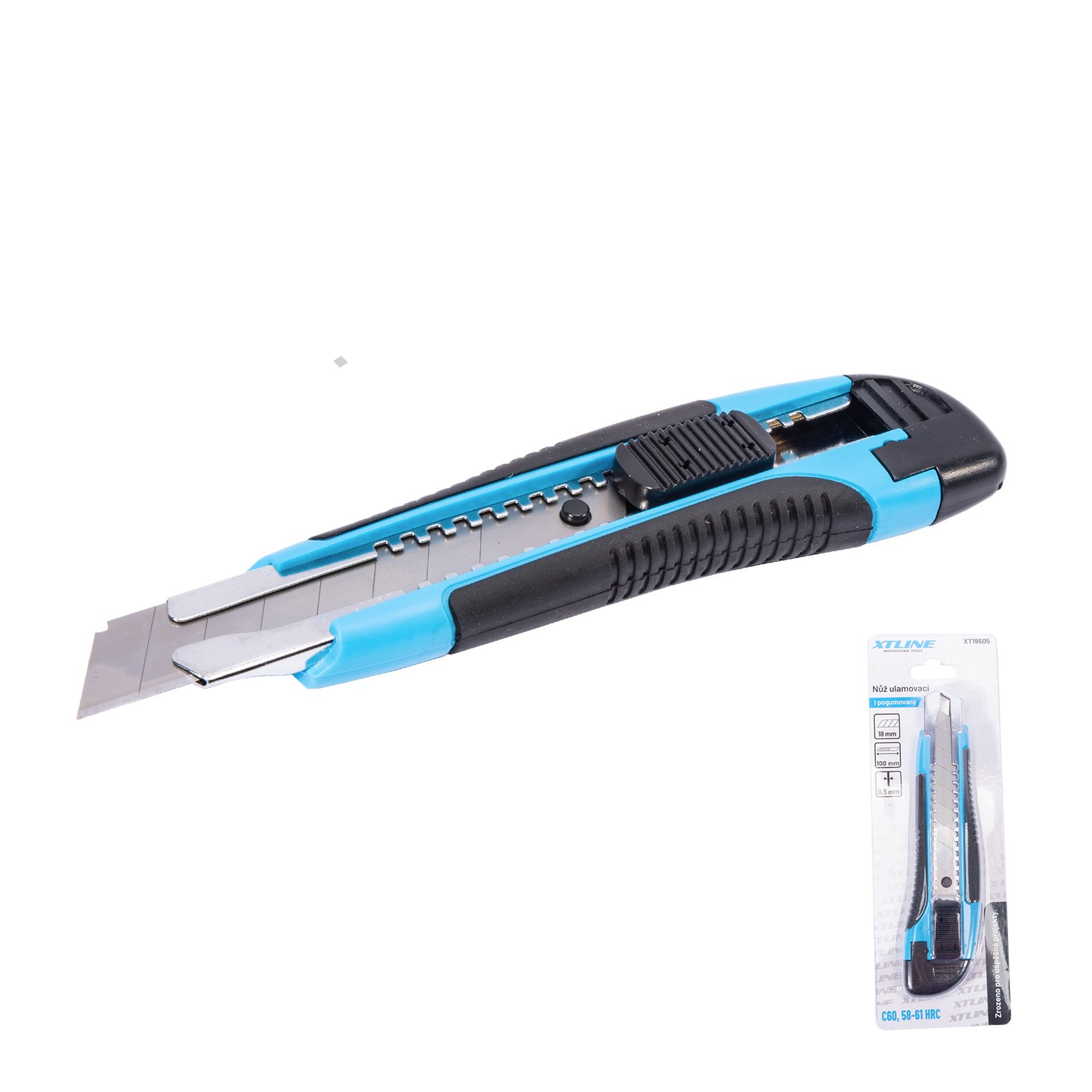 - nůž s ulamovacím hrotem - plastové ABS tělo - kovová vodící lišta - rukojeť potažena gumou - včetně 3 ks náhradních čepelí