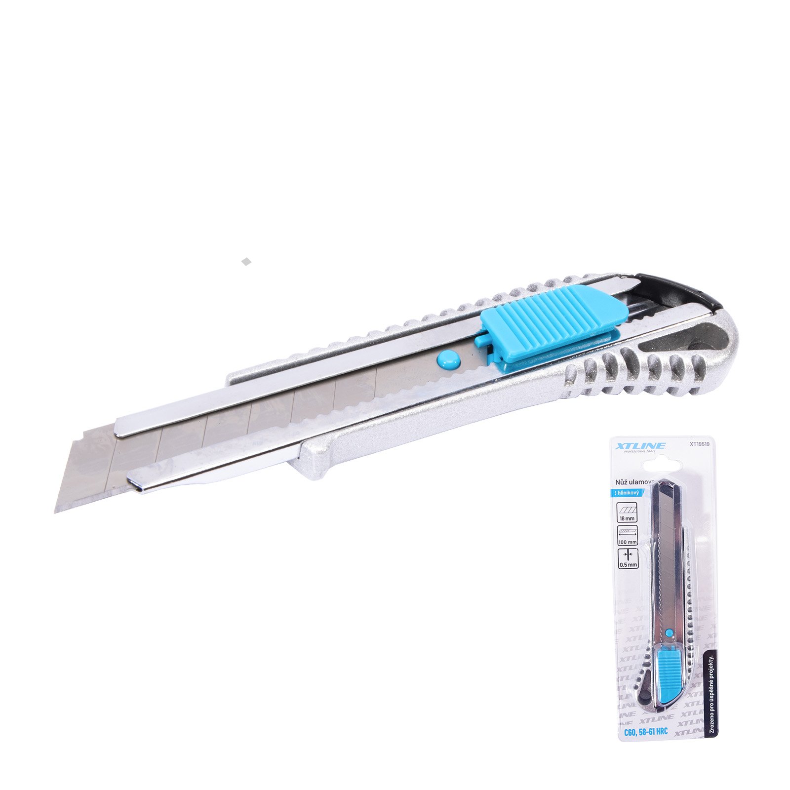- celokovové tělo nože - protiskluzné plastové výstupky - kovová lišta - automatická posuvná aretace - do nože lze umístit až 2 náhradní břity