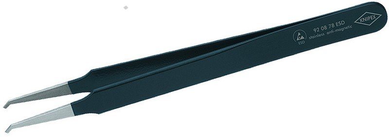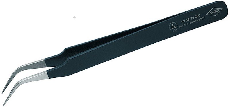- chromniklová ocel, nerezová, antimagnetická (18/10) - povrchová úprava v provedení ESD - matově černá, s povrchovým odporem asi 10^5 ohmů - hroty kartáčované do matového lesku - plochy čelistí matované pro optimální uchopení - pro SMD-techniku - zahnuté hroty - plochy čelistí hladké