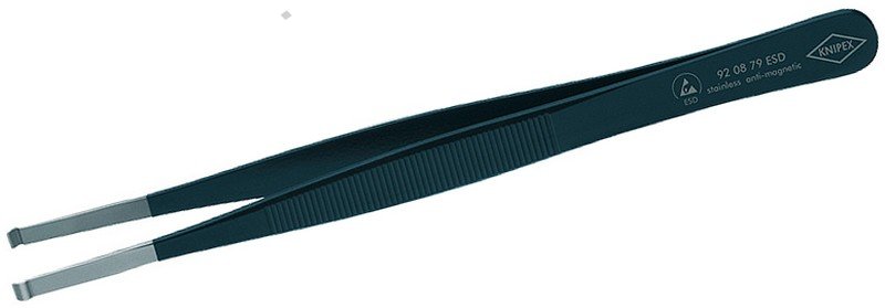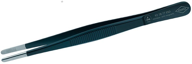 - chromniklová ocel, nerezová, antimagnetická (18/10) - povrchová úprava v provedení ESD - matově černá, s povrchovým odporem asi 10^5 ohmů - hroty kartáčované do matového lesku - plochy čelistí matované pro optimální uchopení - k uchopování horizontálně uspořádaných válcových součástek s průměrem 1,0 mm - plochy čelistí hladké - drážkované rukojeti