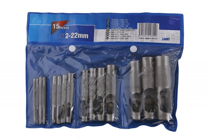 - 15 dílná sada ocelových děrovačů na kůži - boční výhoz odpadu - průměr: 2,0 / 2,5 / 3,2 / 4,0 / 4,8 / 5,0 / 6,4 / 8,0 / 9,5 / 11,1 / 12,7 / 14,0 / 15,8 / 19,0 / 22,0mm