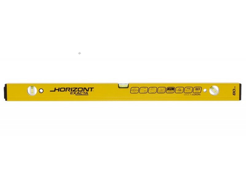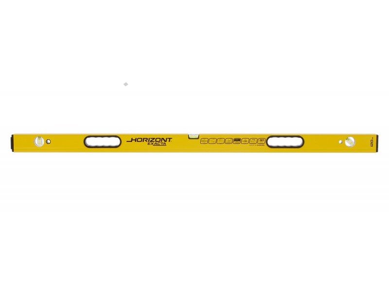 - vodováha Horizont EXACTA se třemi libelami - přesnost 0,3mm/m = 0,017° - kapalina v libelách je fluorescenční a UV stabilní - horizontální optická libela, usnadňuje a zvyšuje přesnost měření - dvojité kroužky v libele umožňují nastavit sklon 2% - zelílený ALU profil 2,2mm - frézovaná základna - odolná proti provozním nárazům