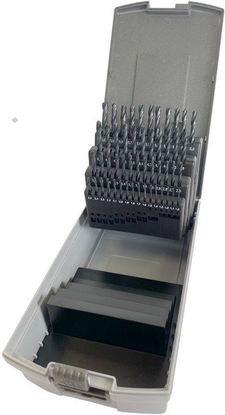 - 25-dílná souprava válcovaných vrtáků HSS-R DIN338 - v kovové kazetě - výkonné vrtáky doporučené pro vrtání v součástkách z legované i nelegované oceli, ocelolitiny do pevnosti 900 N/mm2, šedé, temperované i tvárné litiny, spékané oceli,hliníkové slitiny s krátkou třískou, bronzu, houževnaté mosazi apod.