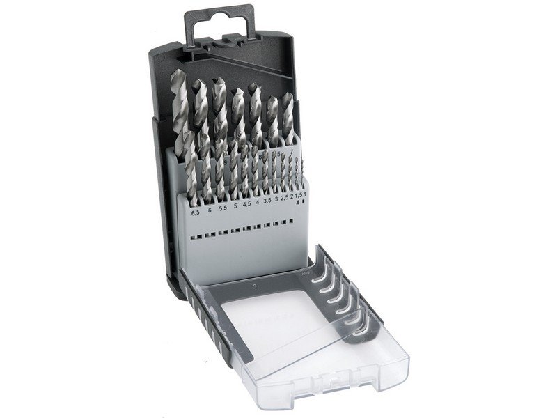 - 19-ti dílná souprava vybrusovaných vrtáků HSS-G DIN338 - v plastová kazetě - výkonné vrtáky doporučené pro vrtání v součástkách z legované i nelegované oceli, ocelolitiny do pevnosti 900 N/mm2, šedé, temperované i tvárné litiny, spékanéoceli, hliníkové slitiny s krátkou třískou, bronzu, houževnaté mosazi apod.