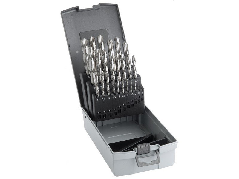 - 25-dílná souprava vybrusovaných vrtáků HSS-G DIN338 - v kovové kazetě - výkonné vrtáky doporučené pro vrtání v součástkách z legované i nelegované oceli, ocelolitiny do pevnosti 900 N/mm2, šedé, temperované i tvárné litiny, spékané oceli,hliníkové slitiny s krátkou třískou, bronzu, houževnaté mosazi apod.